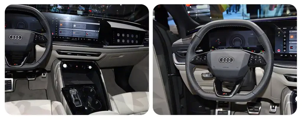 Интерьер выполнен в соответствии с последним фирменным стилем Audi. Изогнутая двухэкранная архитектура объединяет 11,9-дюймовую цифровую приборную панель и 14,5-дюймовый центральный сенсорный дисплей, дополняемые 13,1-дюймовым проекционным дисплеем (HUD) и 10,9-дюймовым экраном для переднего пассажира, ориентированным на молодую и технологически продвинутую аудиторию.