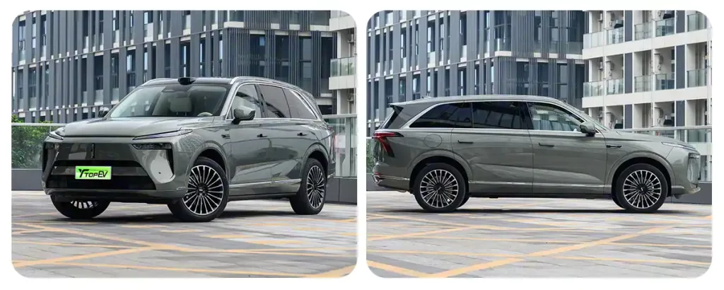 В профиль автомобиль оснащён утопленными дверными ручками и легкосплавными многоспицевыми дисками, создающими элегантный и премиальный облик. Сзади установлена светодиодная световая полоса во всю ширину кузова, дополненная синими индикаторами интеллектуального вождения, придавая автомобилю современный и свежий стиль.